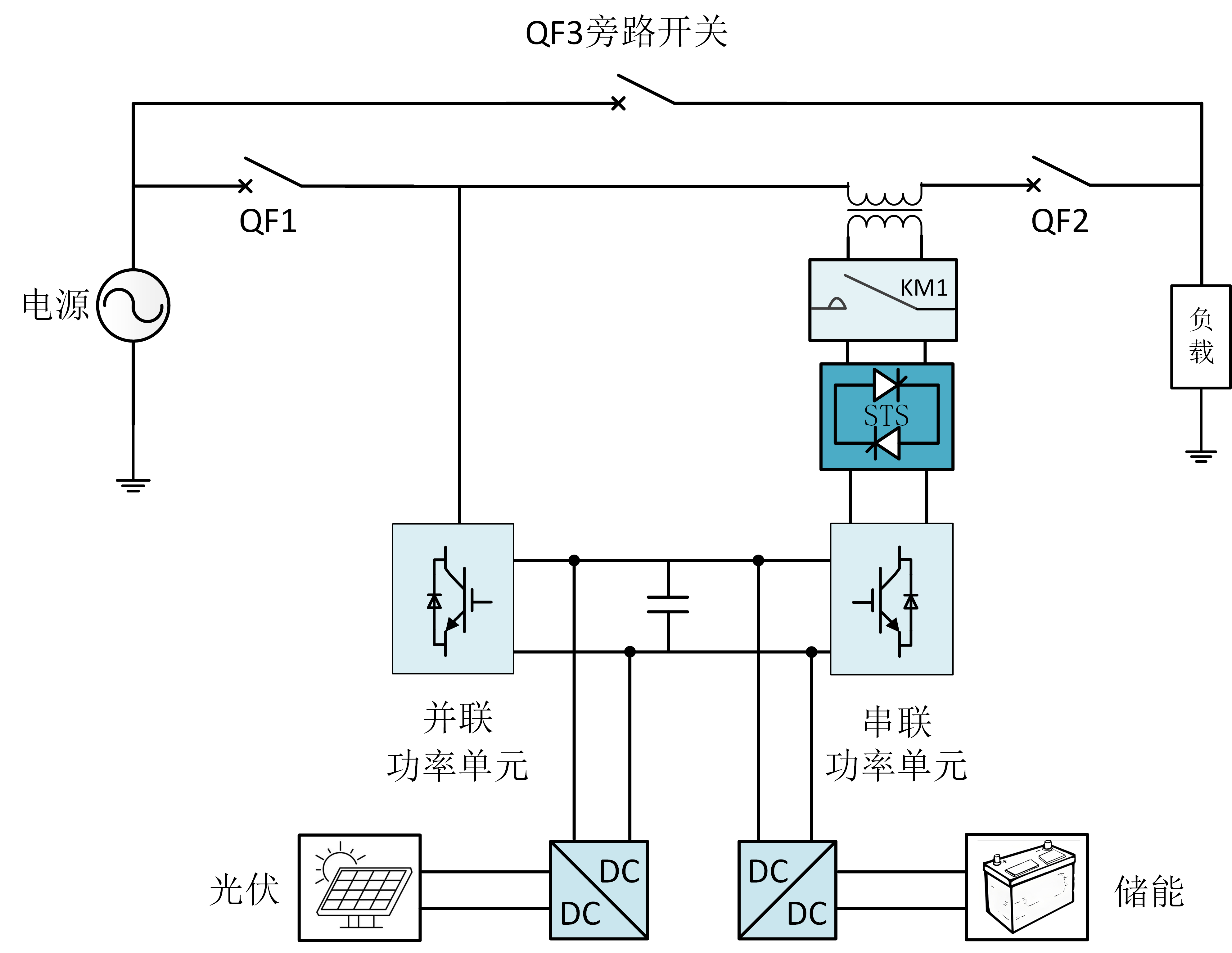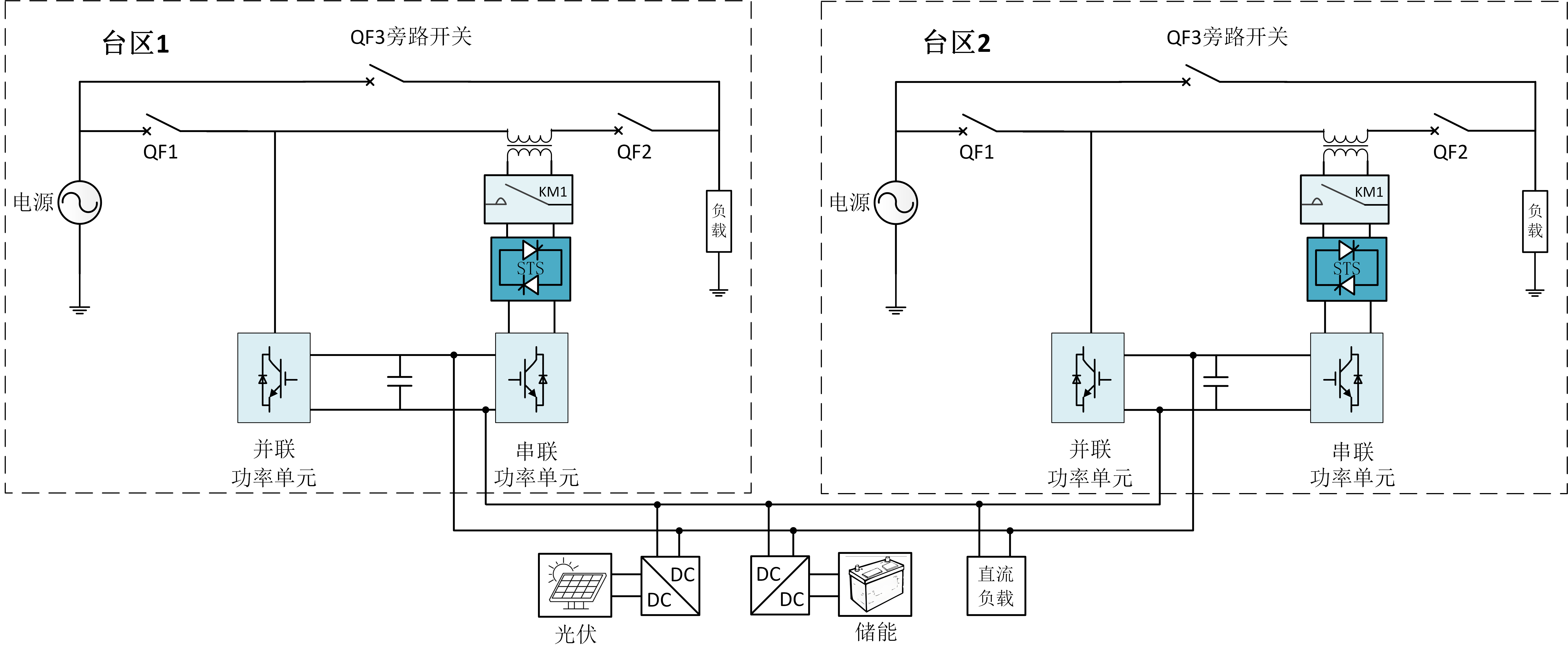 系统通过串并联功率单元配合使用,完成交直流电源和设备的互通与融合;