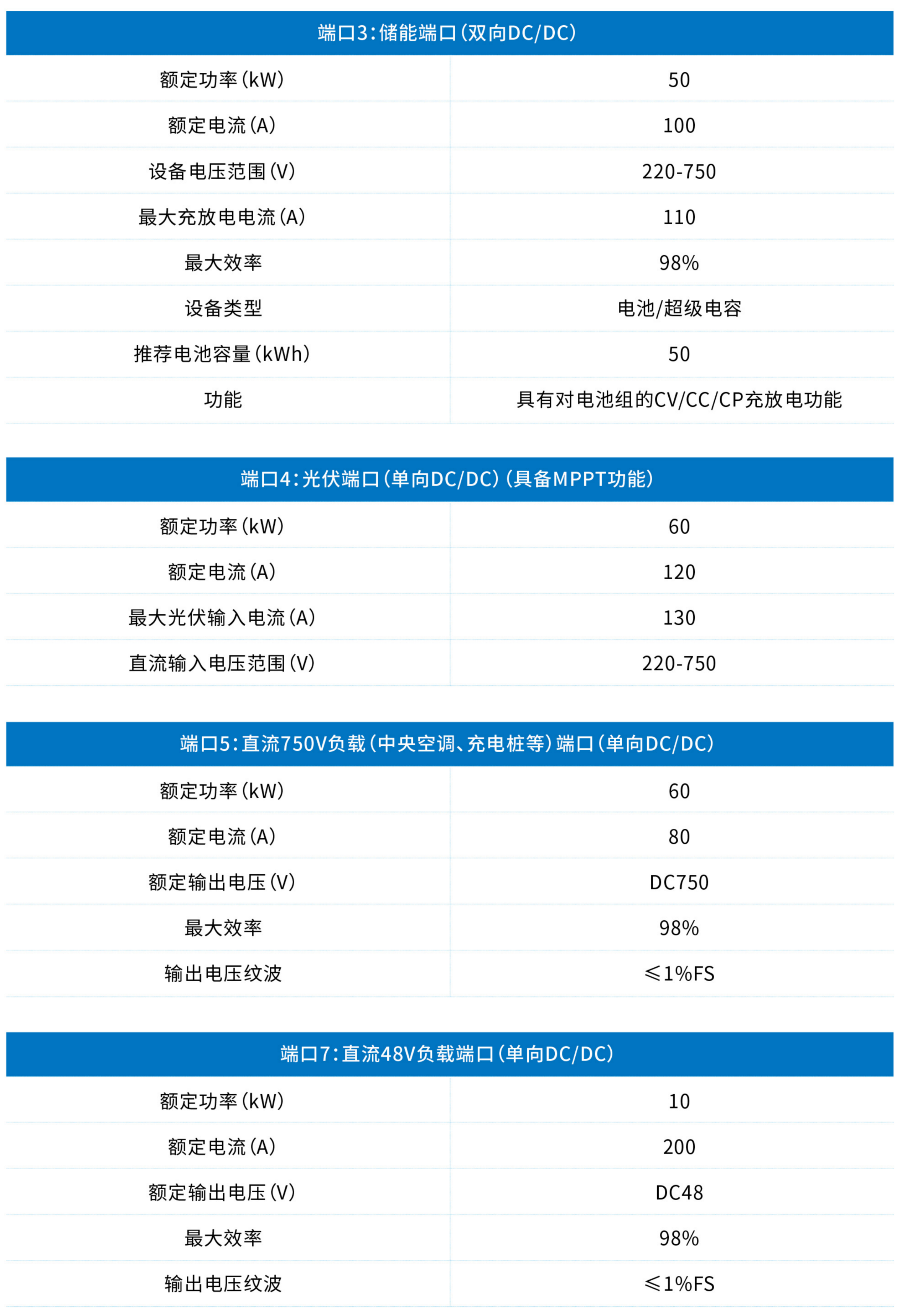 本公司生产的标准多端口电能路由器包含七个端口,其中两个交流端口接市电或交流负载;五个直流端口分别接入储能、光伏和三种电压的直流负载,每个端口均可接入相应电压等级的有源或无源设备,任意端口间可以实现功率潮流的控制。