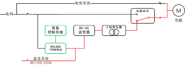 该系统在正常情况下由电网电源供电,经由切换单元为后端负载提供交流电源,同时设备辅助电源也取自电网电源。直流系统电源(DC110V/220V)通过断路器分别接入逆变器与设备辅助电源,此时逆变器处于热备用状态。当电网发生断电时,逆变器立即切换为运行模式,将直流电转换为交流电,为后续负载提供不间断的电力供应。